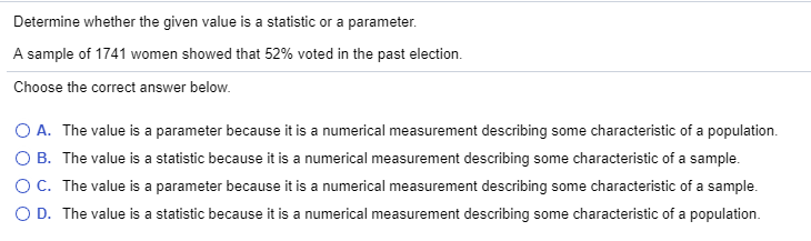 Statistic because the value is a numerical measurement describing a characteristic of a sample. Parameter - a numerical measurement describing some characteristic of a population. A numerical measurement describing some characteristic of a sample.